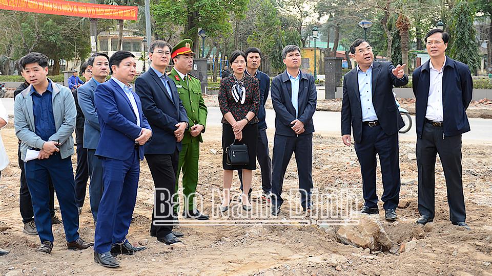 | Đồng chí Bí thư Tỉnh ủy Phạm Gia Túc và lãnh đạo thành phố Nam Định kiểm tra công trình cải tạo công viên Hòa Bình. |
