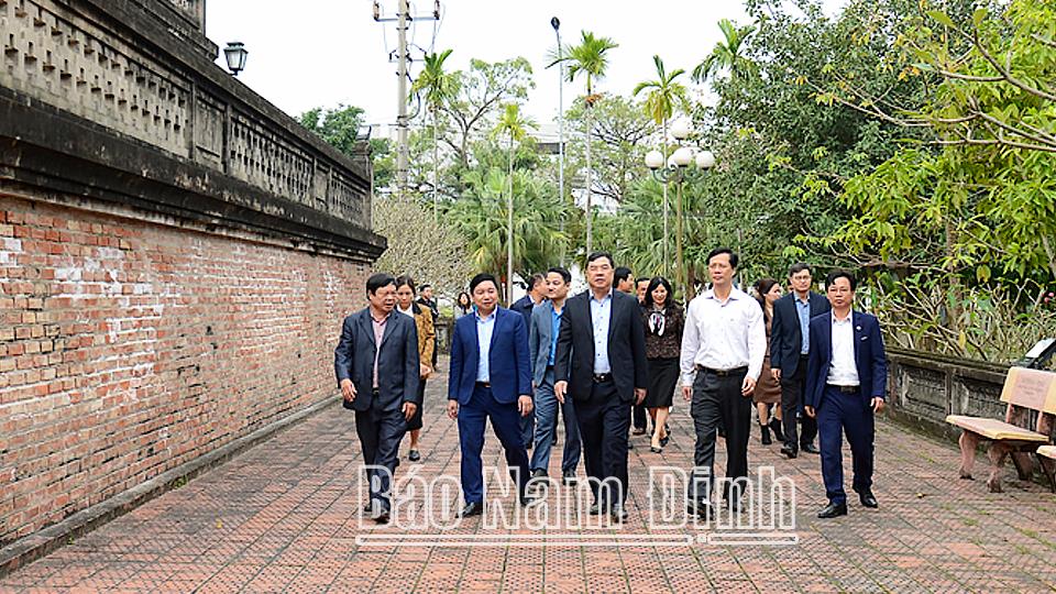 | Đồng chí Bí thư Tỉnh ủy Phạm Gia Túc và lãnh đạo thành phố Nam Định, Sở Văn hóa, Thể thao và Du lịch kiểm tra khuôn viên Cột cờ Nam Định. |