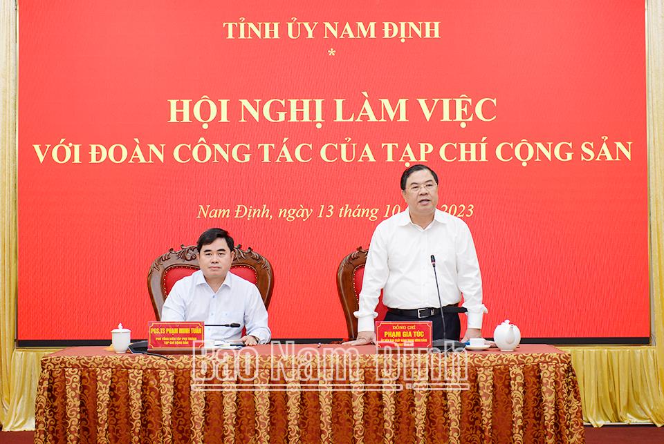 Phát biểu tại buổi làm việc, đồng chí Bí thư Tỉnh ủy Phạm Gia Túc nhấn mạnh những thành quả nổi bật tỉnh Nam Định đạt được trong những năm qua, nhất là từ sau Đại hội Đảng bộ tỉnh khóa XX, nhiệm kỳ 2020-2025 đến nay. Trong đó công tác xây dựng Đảng và hệ thống chính trị thường xuyên được quan tâm, đẩy mạnh toàn diện trên các lĩnh vực chính trị, tư tưởng, đạo đức, tổ chức và cán bộ. Kinh tế từng bước phát triển. Xây dựng nông thôn mới là điểm sáng trong toàn quốc. Giáo dục - đào tạo giữ vững vị thế tốp đầu. Hiện tỉnh đang tập trung xây dựng hệ thống đường giao thông đối nội, đối ngoại kết nối đến các sân bay, cảng biển lớn; chú trọng thu hút đầu tư với các doanh nghiệp lớn, công nghệ cao, sản phẩm thân thiện với môi trường; đẩy mạnh phát triển công nghiệp, thương mại, dịch vụ; giảm dần tỷ trọng nông nghiệp, nhưng vẫn coi nông nghiệp là trụ đỡ của nền kinh tế; từng bước tăng thu ngân sách để tự cân đối vào những năm tới… Đồng chí Bí thư Tỉnh ủy đề nghị Tạp chí Cộng sản tăng cường thông tin tuyên truyền, quảng bá hình ảnh cho tỉnh nhằm khích lệ, động viên cán bộ, đảng viên và nhân dân nỗ lực cố gắng xây dựng tỉnh ngày càng phát triển.