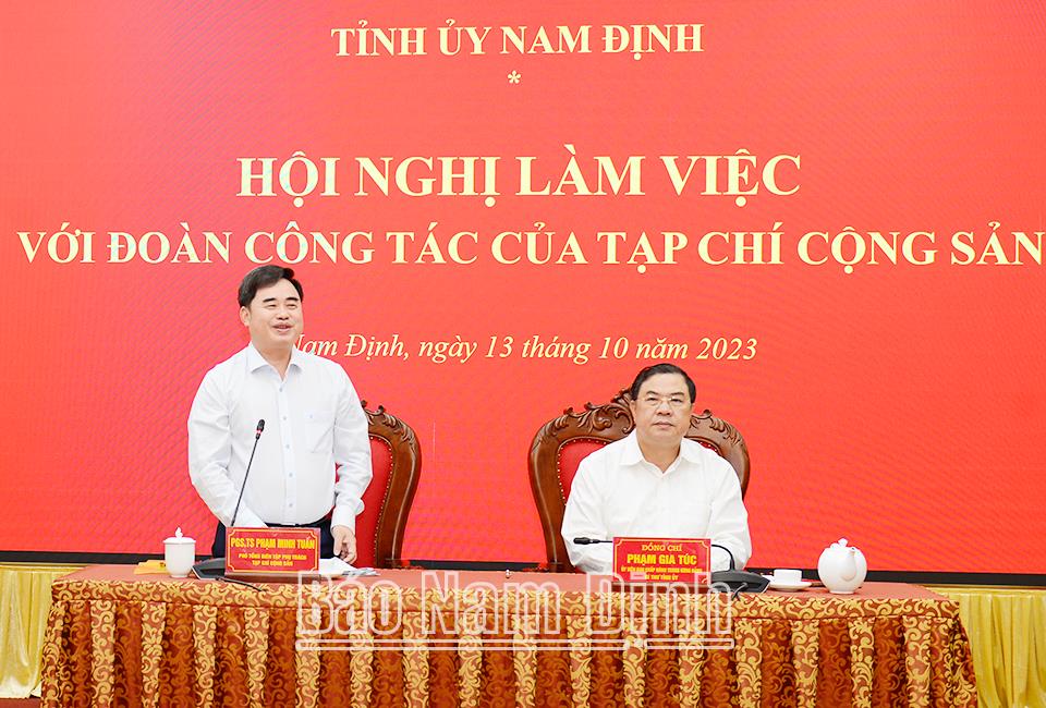 Đồng chí PGS.TS Phạm Minh Tuấn, Phó Tổng Biên tập phụ trách Tạp chí Cộng sản phát biểu cảm ơn Thường trực, Ban Thường vụ Tỉnh ủy Nam Định và trực tiếp là đồng chí Bí thư Tỉnh ủy đã dành thời gian làm việc với Đoàn, cung cấp nhiều thông tin hữu ích giúp các nhà báo, nhà nghiên cứu xây dựng nội dung tuyên truyền đăng tải trên Tạp chí thời gian tới. Đồng chí mong muốn sự hợp tác, phối hợp giữa Tạp chí Cộng sản và tỉnh Nam Định ngày càng gắn bó, bền chặt hơn, vì sự nghiệp chung. Phát huy vai trò, vị trí là cơ quan lý luận chính trị của Ban Chấp hành Trung ương Đảng, Đoàn công tác sẽ tiếp thu thực tiễn từ Nam Định, tổng kết những cách làm hay, mô hình tốt từ cơ sở nhằm cung cấp những căn cứ, luận điểm cho Đảng xây dựng, ban hành các nghị quyết để lãnh đạo, chỉ đạo toàn diện các lĩnh vực thúc đẩy sự phát triển trong thời gian tới.