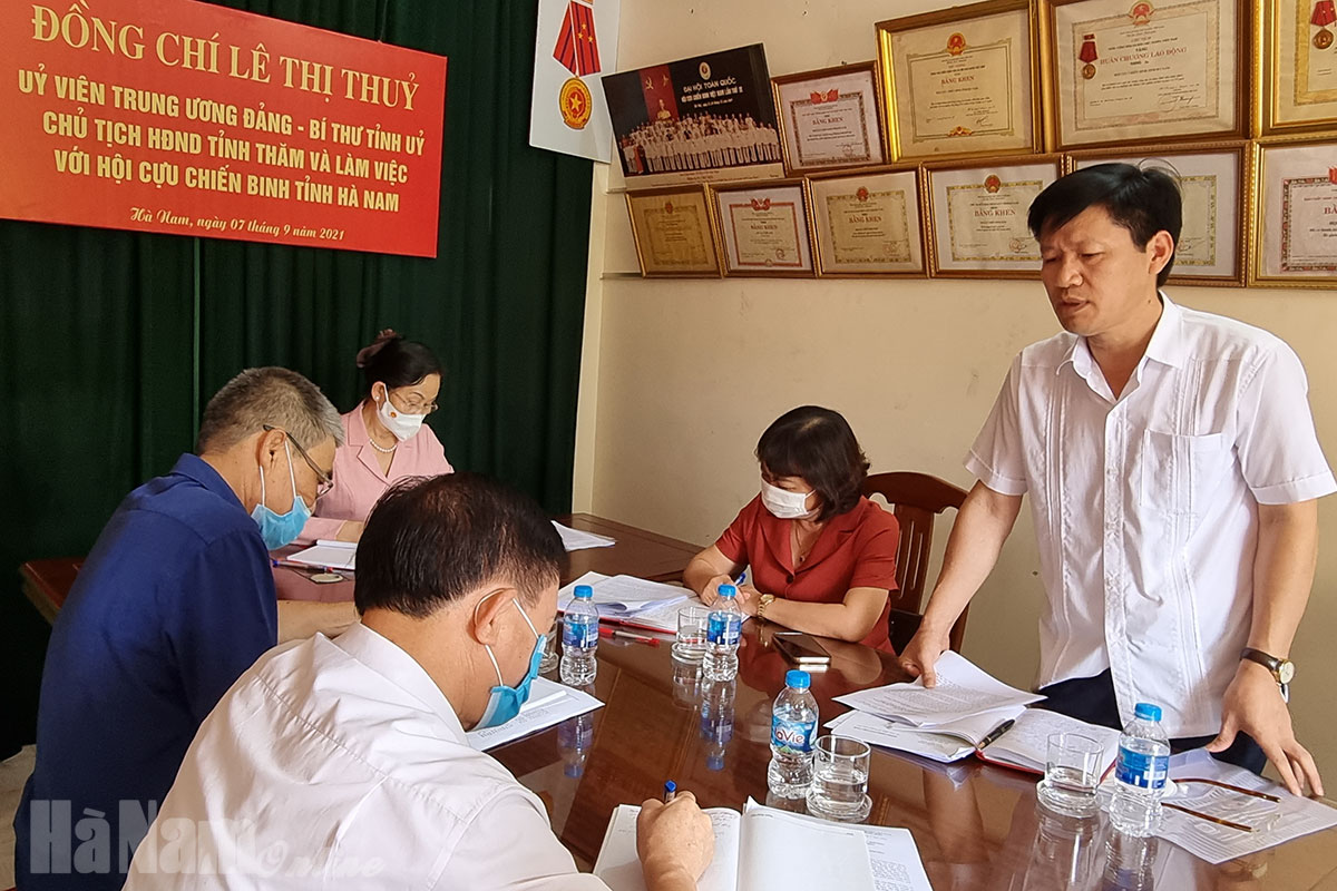Tại buổi làm việc, lãnh đạo Hội CCB tỉnh đã báo cáo với đồng chí Bí thư Tỉnh ủy và đoàn công tác về hoạt động Hội CCB tỉnh 8 tháng năm 2021. Hội CCB tỉnh hiện có 45.450 hội viên, sinh hoạt tại 176 hội cơ sở. Dưới sự lãnh đạo của cấp ủy Đảng, sự chỉ đạo của chính quyền các cấp, sự phối hợp có hiệu quả với các ban, ngành, đoàn thể và sự cố gắng nỗ lực, đoàn kết khắc phục khó khăn của cán bộ, hội viên, Hội CCB tỉnh đã thực hiện tốt các nhiệm vụ được giao. Trong đó, phát huy truyền thống Bộ đội Cụ Hồ tích cực tham gia xây dựng bảo vệ Đảng, chính quyền, nhân dân. Thực hiện tốt các chính sách an sinh xã hội, đoàn kết giúp nhau phát triển kinh tế, giảm nghèo, tham gia tích cực cùng cộng đồng trong phòng chống dịch bệnh Covid-19, góp phần đảm bảo an ninh chính trị, trật tự an toàn xã hội. Hội CCB tỉnh có trên 2.500 mô hình sản xuất kinh doanh, trong đó, 86 doanh nghiệp vừa và nhỏ, 66 hợp tác xã, tổ hợp tác; 148 doanh trại…