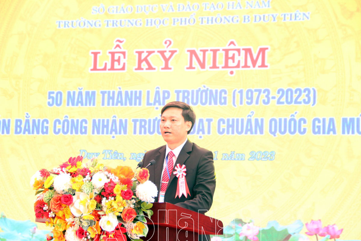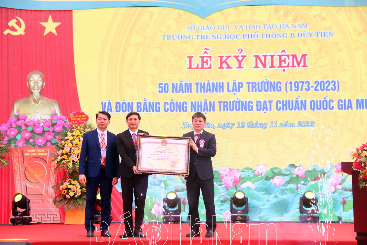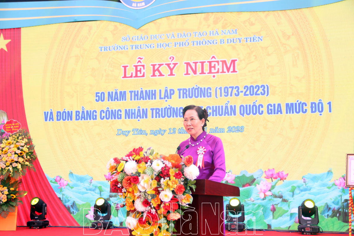 Sáng 12/11, Trường THPT B Duy Tiên (thị xã Duy Tiên) long trọng tổ chức kỷ niệm 50 năm ngày thành lập trường (1973-2023) và đón nhận Bằng công nhận trường đạt chuẩn quốc gia mức độ 1. Đồng chí Lê Thị Thủy, Ủy viên Trung ương Đảng, Bí thư Tỉnh ủy, Chủ tịch HĐND tỉnh đến dự, chúc mừng thầy trò nhà trường