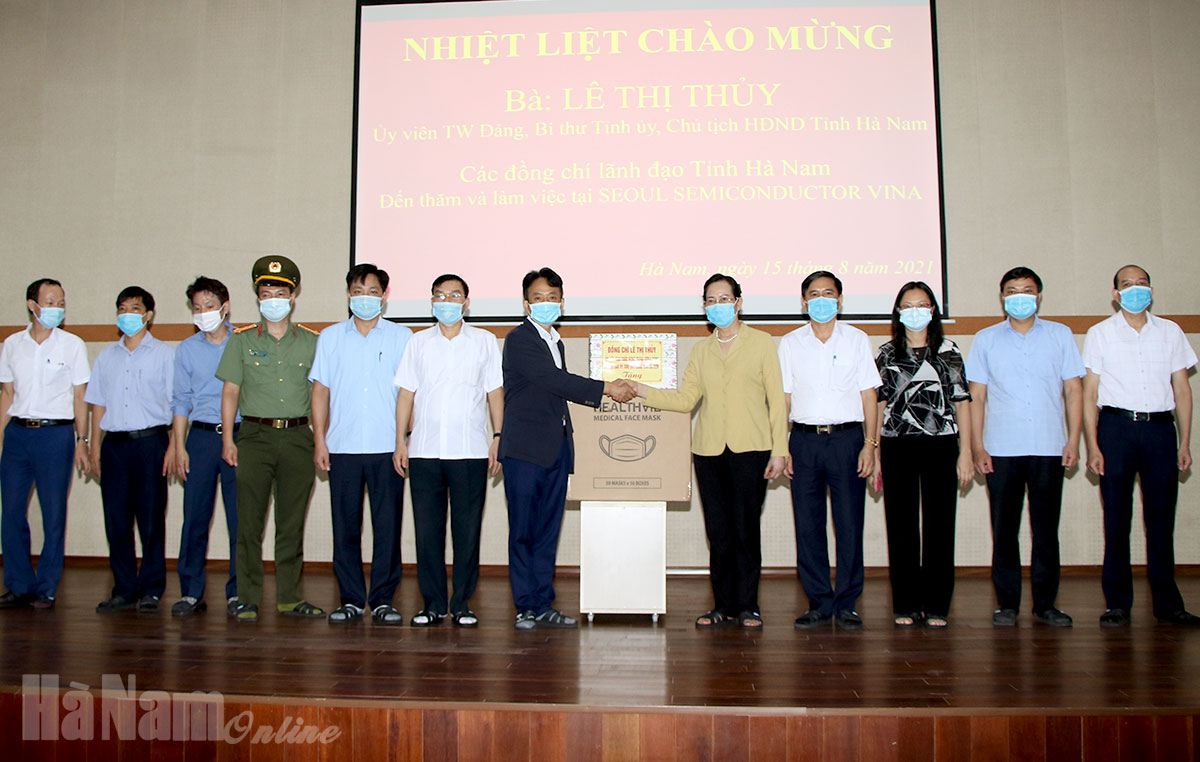 Đến thăm và kiểm tra công tác phòng chống dịch bệnh của Công ty TNHH JY Hà Nam (Phố Cà, xã Thanh Nguyên, huyện Thanh Liêm) và Công ty Seoul Semiconductor VinaCo (Khu Công nghiệp Đồng Văn 1, Thị xã Duy Tiên), đồng chí Bí thư Tỉnh ủy Lê Thị Thuỷ rất phấn khởi, tin tưởng vào các hoạt động phòng, chống dịch bài bản, đúng quy định, đúng với hướng dẫn của các cấp, các ngành, Ban Chỉ đạo phòng chống dịch Covid-19 của tỉnh ở các doanh nghiệp, đảm bảo vừa duy trì sản xuất kinh doanh, vừa tạo việc làm và thu nhập ổn định cho hàng nghìn lao động, trong đó có nhiều lao động địa phương.