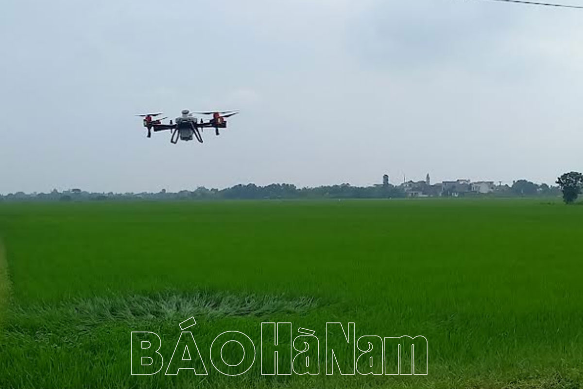 Sử dụng máy bay không người lái bón phân hữu cơ Nano canxi silic tại cánh đồng thôn Cự Xá.