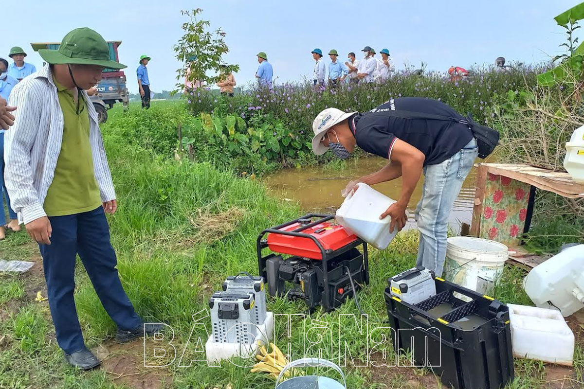 Đồng chí Bí thư Tỉnh ủy Lê Thị Thủy thăm mô hình lúa sử dụng phân bón hữu cơ Nano canxi silic tại cánh đống thôn Nguyễn Trung.