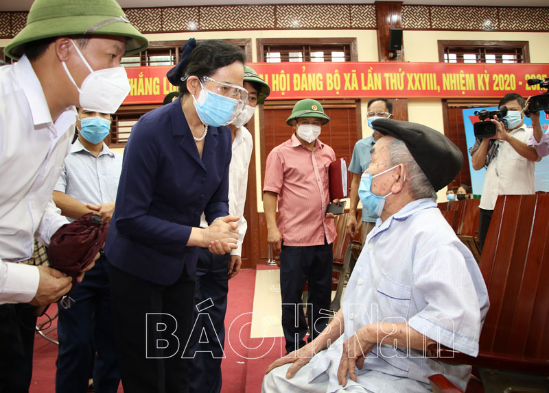 Đồng chí Bí thư Tỉnh uỷ Lê Thị Thuỷ động viên tinh thần người cao tuổi khi đến điểm tiêm chủng Vaccine Covid-19 xã Khả Phong