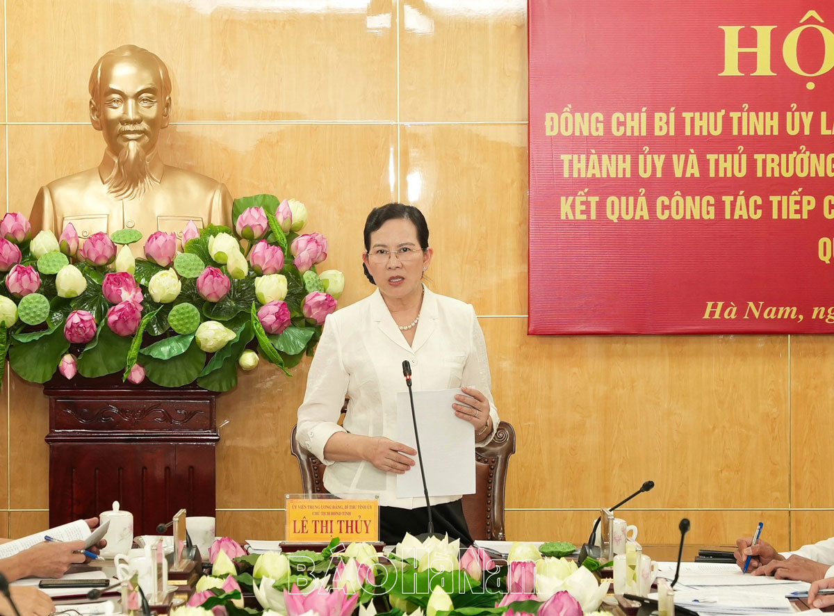Phát biểu kết luận hội nghị, đồng chí Bí thư Tỉnh ủy Lê Thị Thủy ghi nhận, đánh giá cao nỗ lực, cố gắng của các địa phương, cơ quan, đơn vị trong công tác tiếp dân, giải quyết KNTC thời gian qua. Về nhiệm vụ thời gian tới, đồng chí Bí thư Tỉnh uỷ yêu cầu: Cấp ủy, chính quyền các cấp và đội ngũ cán bộ, đảng viên, trước hết là người đứng đầu phải nâng cao hơn nữa vai trò, trách nhiệm trong công tác tiếp công dân, giải quyết KNTC, xử lý phản ánh, kiến nghị của công dân; tập trung giải quyết những vụ việc đông người, phức tạp, kéo dài.