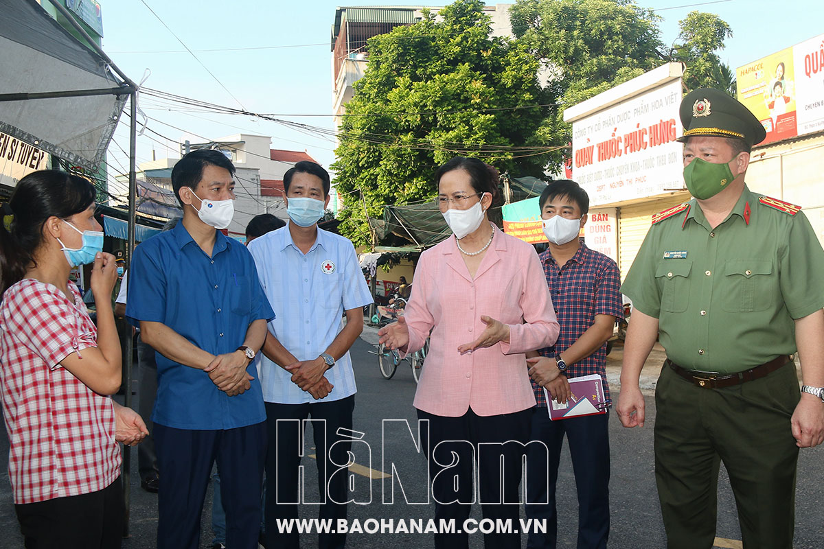 Đồng chí Bí thư Tỉnh ủy Lê Thị Thủy trao đổi với lãnh đạo thành phố Phủ Lý và lãnh đạo xã Phù Vân về việc chăm lo đời sống cho người dân trong vùng phong tỏaĐồng chí Bí thư Tỉnh ủy trao quà cho đại diện Hội Chữ thập đỏ xã Phù Vân để chuyển vào cho người dân khu phong tỏa thôn Lê Lợi.