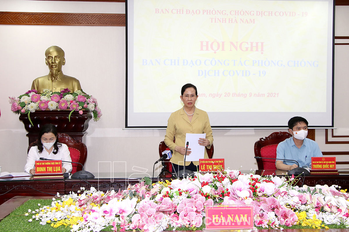 Kết luận hội nghị, đồng chí Lê Thị Thuỷ, Ủy viên Trung ương Đảng, Bí thư Tỉnh uỷ, Chủ tịch HĐND tỉnh, Trưởng Ban Chỉ đạo phòng chống dịch Covid-19 tỉnh ghi nhận những nỗ lực và tinh thần chủ động của các địa phương trong công tác phòng chống dịch thời gian qua, góp phần thực hiện tốt mục tiêu kép, ngăn chặn được dịch bệnh, bảo vệ sức khoẻ của nhân dân.