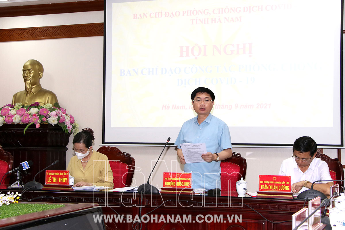 Theo đồng chí Trương Quốc Huy, Phó Bí thư Tỉnh uỷ, Chủ tịch UBND tỉnh, Trưởng đoàn Đại biểu Quốc hội tỉnh,Phó BCĐ, Chỉ huy trưởng Trung tâm Chỉ huy phòng chống dịch bệnh Covid-19 tỉnh, để đảm bảo hiệu quả công tác phòng, chống dịch Covid-19, đồng chí đề nghị tạm dừng các dịch vụ ăn uống, vui chơi giải trí, tổ chức Rằm Trung thu và học tập trung của học sinh tại trường học. Đẩy nhanh tiến độ tiêm Vacine và tuyên truyền cho nhân dân nhận thức đúng đắn về việc tiêm chủng Vacine Covid-19, điều phối hợp lý lượng Vacine cho các địa phương, doanh nghiệp ngoài khu công nghiệp, ưu tiên cho thành phố tiêm đủ, tiêm trước. Tăng cường công tác tuyên truyền cho nhân dân nâng cao ý thức phòng, chống dịch . Đối với các chốt kiểm soát dịch, yêu cầu các địa phương, các ngành chức năng tiếp tục duy trì hoạt động, huy động nguồn lực xã hội hoá hỗ trợ lực lượng này . Đồng chí Chủ tịch UBND tỉnh đề nghị công an rà soát lại vi phạm của hai vợ chồng bệnh nhân Covid-19 ở Phù Vân trong công tác phòng chống dịch để xem xét, xử lý nghiêm khắc.