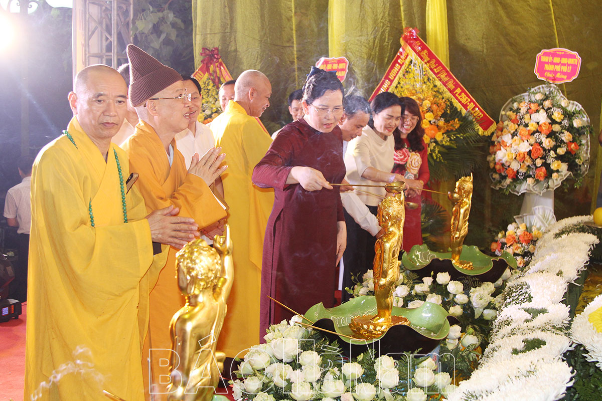 Đồng chí Bí thư Tỉnh ủy Lê Thị Thủy và các đồng chí trong đoàn công tác thực hiện nghi Lễ tắm Phật.