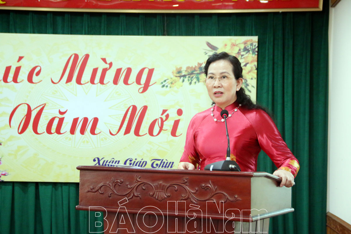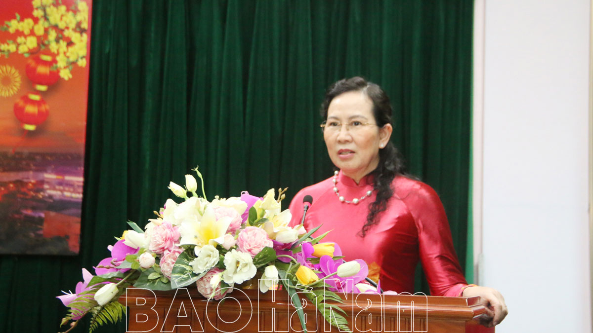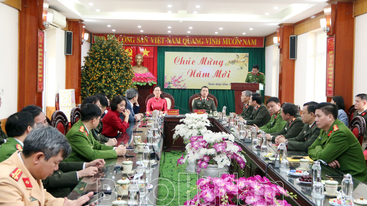 Thay mặt Tỉnh ủy, HĐND, UBND tỉnh, đồng chí Lê Thị Thủy, Ủy viên Trung ương Đảng, Bí thư Tỉnh ủy, Chủ tịch HĐND tỉnh gửi lời chúc Tết tới CBCS Công an tỉnh. Đồng thời khẳng định: năm 2023, lực lượng Công an tỉnh đã chủ động triển khai thực hiện hiệu quả các chủ trương, đường lối, chính sách của Đảng, Nhà nước, Bộ Công an và các nghị quyết, chỉ thị, kết luận, quy định của Tỉnh ủy. UBND tỉnh, hoàn thành thắng lợi các mục tiêu, nhiệm vụ đã đề ra, không để xảy ra bị động, bất ngờ trong mọi tình huống, giữ vững môi trường ổn định để thu hút đầu tư, phát triển kinh tế - xã hội. Công tác đấu tranh phòng, chống tội phạm được triển khai quyết liệt, hiệu quả với nhiều đợt cao điểm tấn công trấn áp tội phạm, bảo bảo bình yên cho cuộc sống của người dân. Đặc biệt, Công an tỉnh đã tham mưu triển khai thực hiện quyết liệt, hiệu quả các nhiệm vụ Đề án số 06 của Chính phủ về phát triển ứng dụng dữ liệu dân cư, định danh và xác thực điện tử phục vụ chuyển đổi số quốc gia giai đoạn 2022 - 2025, tầm nhìn đến năm 2030, mang lại nhiều tiện ích cho doanh nghiệp và nhân dân.
