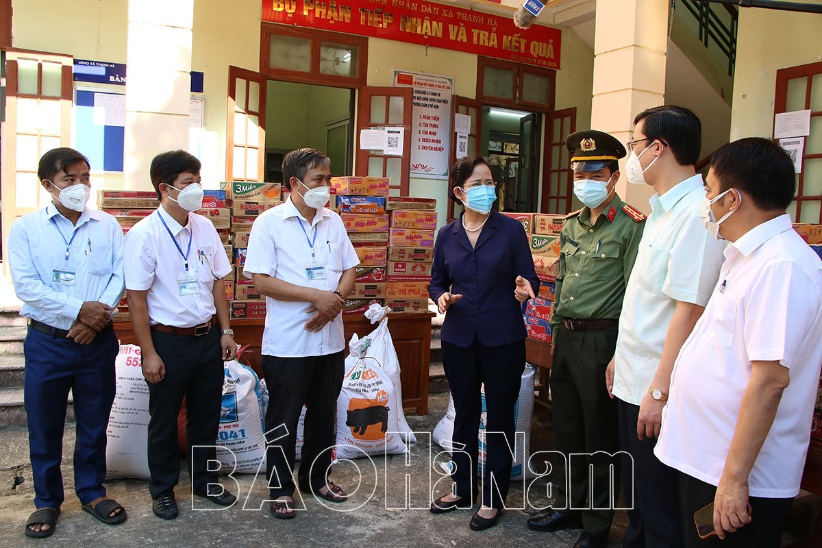 Đồng chí Bí thư Tỉnh uỷ Lê Thị Thuỷ trao tặng nhu yếu phẩm cho xã Thanh Hà và chỉ đạo huyện Thanh Liêm tăng cường chống dịch, sớm kiểm soát tình hình.