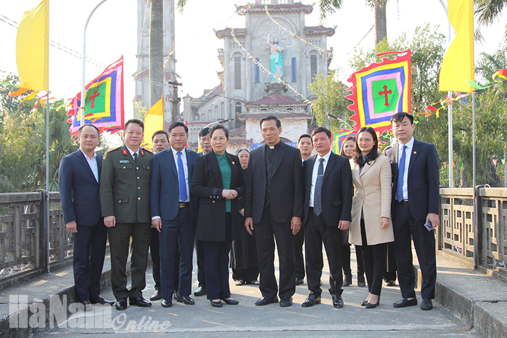 Đồng chí Lê Thị Thủy, Ủy viên Trung ương Đảng, Bí thư Tỉnh ủy, Trưởng đoàn Đại biểu Quốc hội tỉnh tặng hoa chúc mừng Linh mục Lê Thanh Nghị cùng bà con giáo dân Vĩnh Đà, xã Nhân Mỹ, huyện Lý Nhân- Quản giáo hạt Lý Nhân nhân dịp Lễ giáng sinh