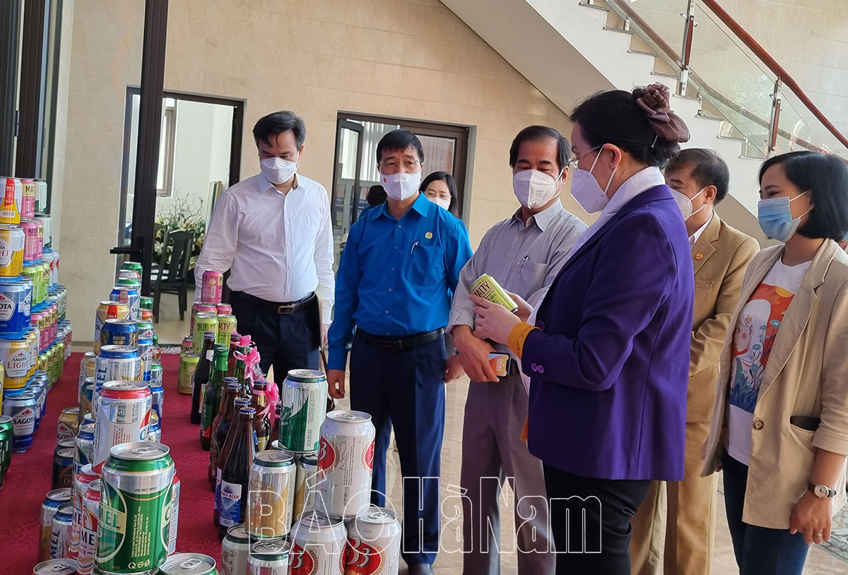 Đồng chí Bí thư Tỉnh ủy Lê Thị Thủy cùng các đại biểu tham quan các sản phẩm chính của Công ty TNHH MTV Bia Sài Gòn-Phủ Lý.