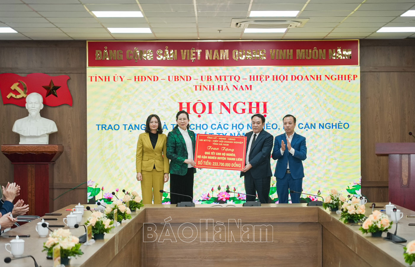 Phát biểu tại hội nghị, đồng chí Bí thư Tỉnh ủy Lê Thị Thủy nhấn mạnh: Chỉ còn hơn 2 tuần nữa chúng ta sẽ đón Tết Nguyên đán Ất Tỵ 2025, để các hộ gia đình còn khó khăn được đón Tết vui tươi, đầm ấm, lãnh đạo tỉnh cùng các nhà hảo tâm, cơ quan, đơn vị, Hiệp hội Doanh nghiệp tỉnh… đã tích cực triển khai kế hoạch chăm lo Tết cho người nghèo; trực tiếp đến các địa phương trao tặng quà cho các gia đình chính sách và hộ nghèo, hộ cận nghèo, hộ có hoàn cảnh khó khăn trong tỉnh. Đề nghị lãnh đạo huyện Thanh Liêm nhanh chóng chỉ đạo triển khai kế hoạch phân bổ, trao tặng đến tay các hộ nghèo kịp thời, đúng đối tượng để các hộ đón Tết đầy đủ hơn. Đồng chí Bí thư Tỉnh ủy trân trọng cảm ơn cộng đồng doanh nghiệp, doanh nhân, những người con quê hương Hà Nam, các nhà hảo tâm, cơ quan, đơn vị trong và ngoài tỉnh đã quan tâm, chia sẻ, tích cực tham gia ủng hộ các hoạt động từ thiện, nhất là hoạt động chăm lo Tết cho người nghèo trên địa bàn tỉnh trong nhiều năm qua; góp phần quan trọng giúp tỉnh Hà Nam thực hiện được mục tiêu: “Không để một người dân nào không có Tết”; “Không để bất cứ người nghèo, người có hoàn cảnh khó khăn nào không được quan tâm, hỗ trợ trong dịp Tết Nguyên đán”.