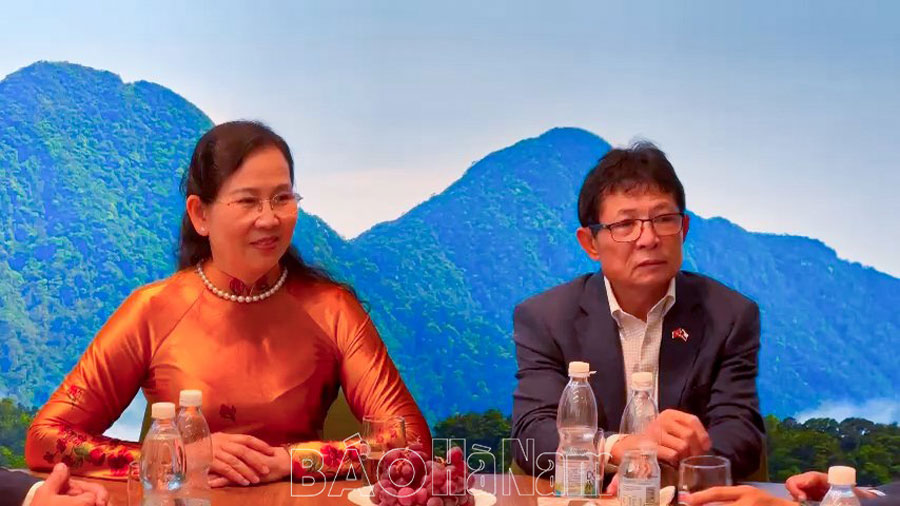 Đồng chí Bí thư Tỉnh ủy Lê Thị Thủy và Đoàn công tác trao quà lưu niệm cho lãnh đạo Tập đoàn Elmich. Ảnh do Đoàn công tác cung cấp