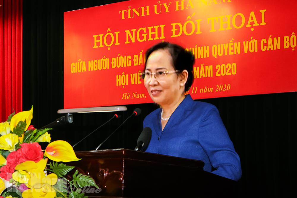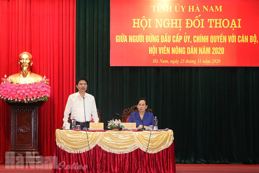 Phát biểu kết luận buổi đối thoại, đồng chí Lê Thị Thủy, Ủy viên Trung ương Đảng, Bí thư Tỉnh ủy ghi nhận và đánh giá cao những ý kiến tâm huyết, thẳng thắn của các đại biểu đại diện cho cán bộ, hội viên nông dân toàn tỉnh. Đồng chí Bí thư Tỉnh ủy cho rằng, đây là những ý kiến chính đáng và thiết thực. Vì vậy, đề nghị, sau buổi đối thoại, UBND tỉnh và các sở, ngành thực hiện nghiêm túc các vấn đề đã trao đổi, thống nhất để giải quyết kịp thời đúng theo các mốc thời gian đã hứa để trả lời sớm nhất cho cán bộ, hội viên nông dân. Văn phòng Tỉnh ủy thông báo kết luận hội nghị đối thoại; UBND tỉnh chỉ đạo giải quyết các kiến nghị của cán bộ, hội viên nông dân và thông báo về Ban Thường vụ Hội Nông dân tỉnh; Hội nông dân phối hợp với UB MTTQ và các tổ chức chính trị xã hội tỉnh theo dõi, giám sát việc thực hiện kết luận sau đối thoại, vận động tuyên truyền để hội viên nông dân đồng thuận và chấp hành.