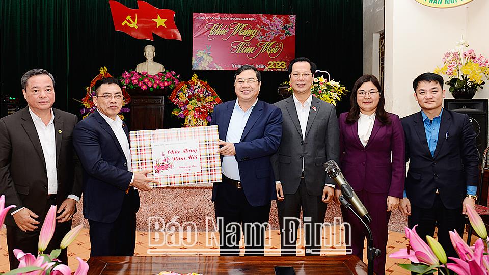 | Đồng chí Bí thư Tỉnh ủy Phạm Gia Túc và các đồng chí lãnh đạo tỉnh tặng quà chúc Tết tập thể Công ty Cổ phần Môi trường Nam Định. |