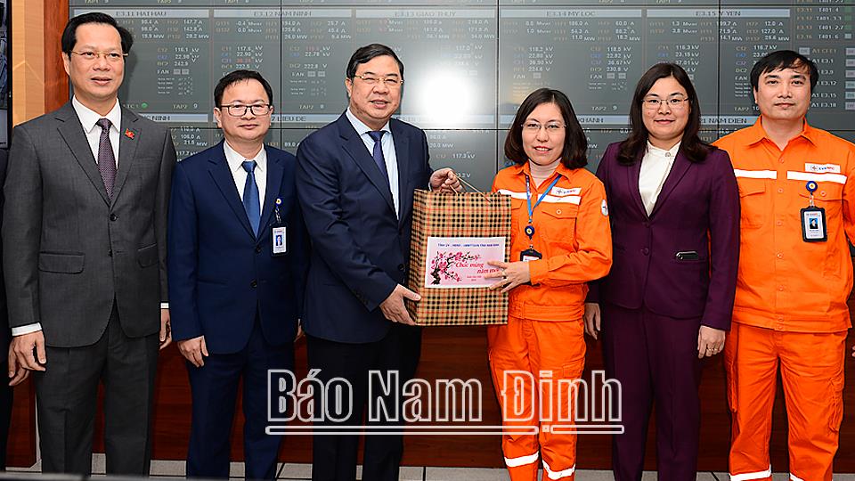 | Đồng chí Bí thư Tỉnh ủy Phạm Gia Túc và các đồng chí lãnh đạo tỉnh tặng quà chúc Tết tập thể Trung tâm Điều khiển xa thuộc Công ty Điện lực Nam Định. |