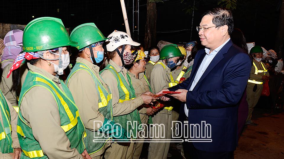 Sau khi chúc Tết tại trụ sở Công ty Cổ phần Môi trường Nam Định, đồng chí Bí thư Tỉnh ủy và các đồng chí lãnh đạo tỉnh đã đến động viên, chúc Tết công nhân môi trường đô thị đang làm nhiệm vụ thu gom rác thải tại điểm tập kết rác trên đường Lê Hồng Phong, thành phố Nam Định.