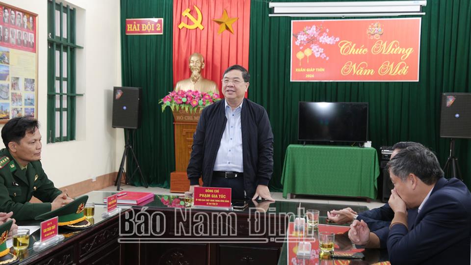 | Đồng chí Phạm Gia Túc, Ủy viên BCH Trung ương Đảng, Bí thư Tỉnh ủy chúc Tết cán bộ, chiến sĩ Đồn Biên phòng Ngọc Lâm và Hải Đội 2 (BĐBP tỉnh). |