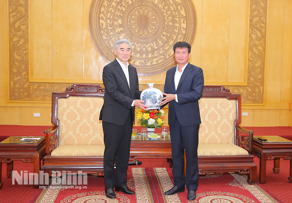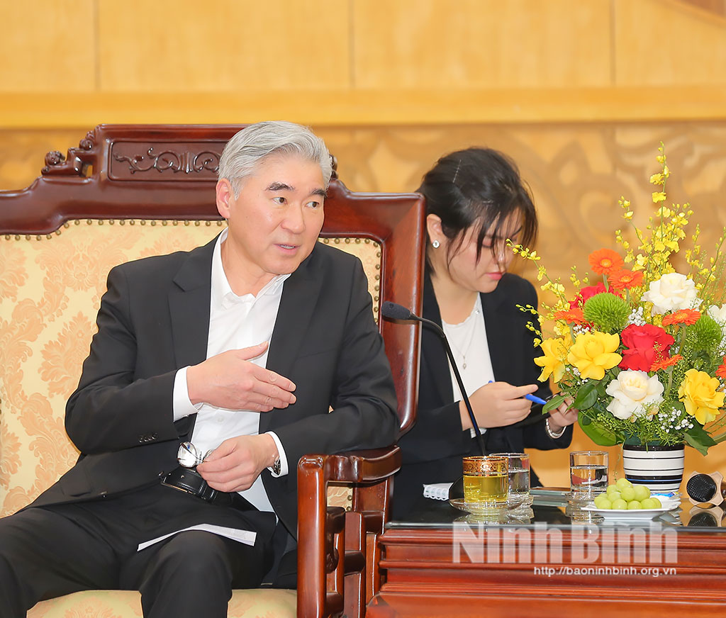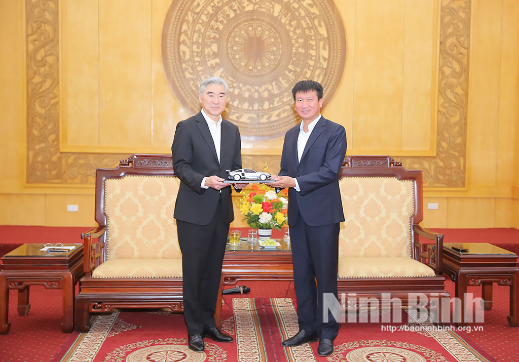 Tại buổi tiếp, đồng chí Bí thư Tỉnh ủy Trần Huy Tuấn nhiệt liệt chào mừng ông Sung Kim và đoàn công tác đến thăm, làm việc tại Ninh Bình; đồng thời, thông tin khái quát về tình hình phát triển kinh tế - xã hội của tỉnh. Theo đó, sau hợp nhất, Ninh Bình tiếp tục duy trì đà tăng trưởng tích cực. Năm 2025, GRDP tăng 10,65%, xếp thứ 3/34 tỉnh, thành phố; quý I năm 2026, GRDP ước đạt trên 76.600 tỷ đồng, tăng 11,63% so với cùng kỳ, đứng đầu khu vực Đồng bằng sông Hồng và xếp thứ 2 toàn quốc. Kết quả này có sự đóng góp quan trọng của cộng đồng doanh nghiệp, trong đó, có liên doanh Hyundai Thành Công.