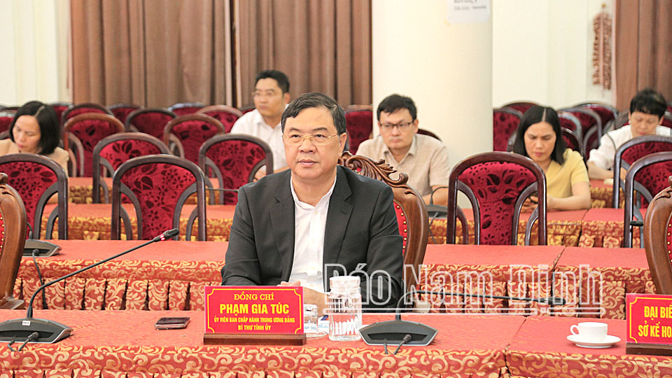 | Đồng chí Phạm Gia Túc, Ủy viên BCH Trung ương Đảng, Bí thư Tỉnh ủy phát biểu tại buổi làm việc. |