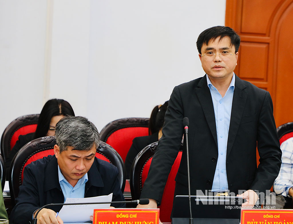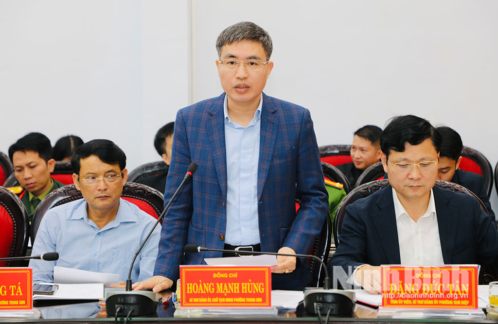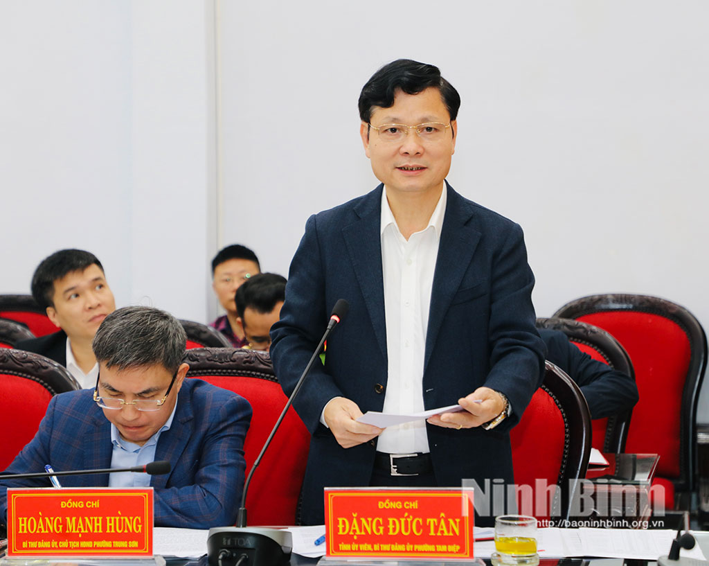 Đồng chí Đặng Đức Tân,Tỉnh ủy viên, Bí thư Đảng ủy phường Tam Điệp phát biểu tại buổi làm việc.Đồng chí Hoàng Mạnh Hùng, Bí thư Đảng ủy, Chủ tịch HĐND phường Trung Sơn phát biểu tại buổi làm việc.Đồng chí Đào Trung Hiếu, Bí thư Đảng ủy xã Quỳnh Lưu phát biểu tại buổi làm việc.