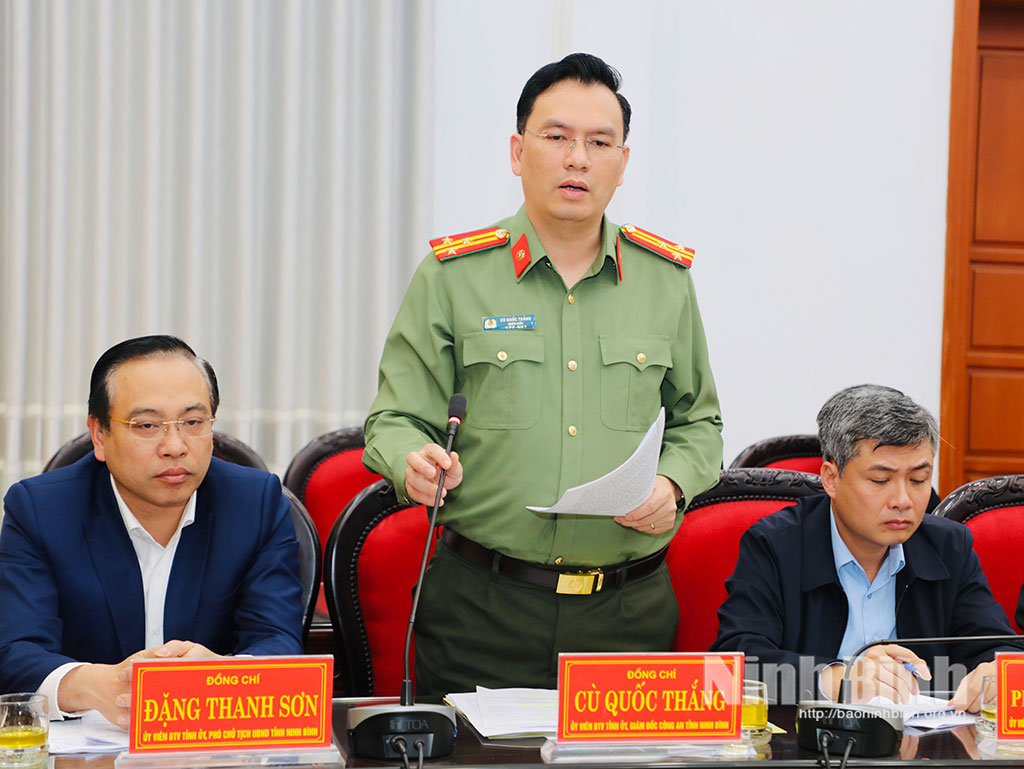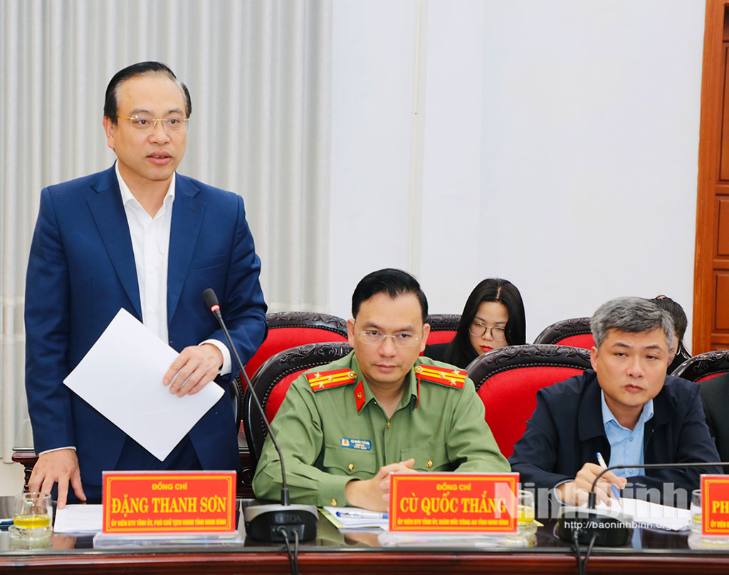 Đồng chí Đặng Thanh Sơn, Ủy viên Ban Thường vụ Tỉnh ủy, Phó Chủ tịch UBND tỉnh phát biểu tại buổi làm việc.Đồng chí Cù Quốc Thắng, Ủy viên Ban Thường vụ Tỉnh ủy, Giám đốc Công an tỉnh phát biểu tại buổi làm việc.Đồng chí Bùi Văn Hoàng, Tỉnh ủy viên, Giám đốc Sở Nội vụ phát biểu tại buổi làm việc.