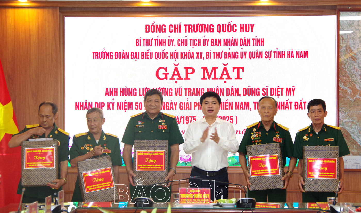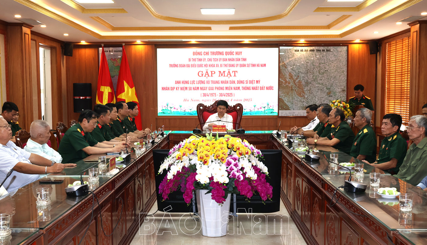 Trong cuộc kháng chiến chống Mỹ, cứu nước, Hà Nam có 32 đồng chí được phong và truy tặng danh hiệu Anh hùng LLVT nhân dân; 11.002 liệt sỹ và hàng chục nghìn thương, bệnh binh. 50 năm kể từ ngày đất nước thống nhất, quân và dân cả nước nói chung, Hà Nam nói riêng đã vượt qua muôn vàn khó khăn, thử thách, từng bước xây dựng và bảo vệ Tổ quốc, giành được những thành tựu to lớn, có ý nghĩa lịch sử trên mọi lĩnh vực. Trong giai đoạn cách mạng mới, tỉnh Hà Nam đã tập trung đẩy mạnh phát triển kinh tế - xã hội, bảo đảm quốc phòng, an ninh và đạt được những kết quả tích cực. Đồng chí Bí thư Tỉnh ủy mong rằng, thời gian tới các Anh hùng LLVT nhân dân, dũng sĩ diệt Mỹ trên địa bàn tỉnh tiếp tục phát huy tinh thần đại thắng mùa Xuân năm 1975, phát huy vai trò gương mẫu, phẩm chất cao đẹp của người lính “Bộ đội Cụ Hồ” trong mọi mặt đời sống xã hội, đồng hành cùng cấp ủy, chính quyền và nhân dân trong các phong trào thi đua, cuộc vận động, góp sức xây dựng quê hương ngày càng đổi mới, vững mạnh.