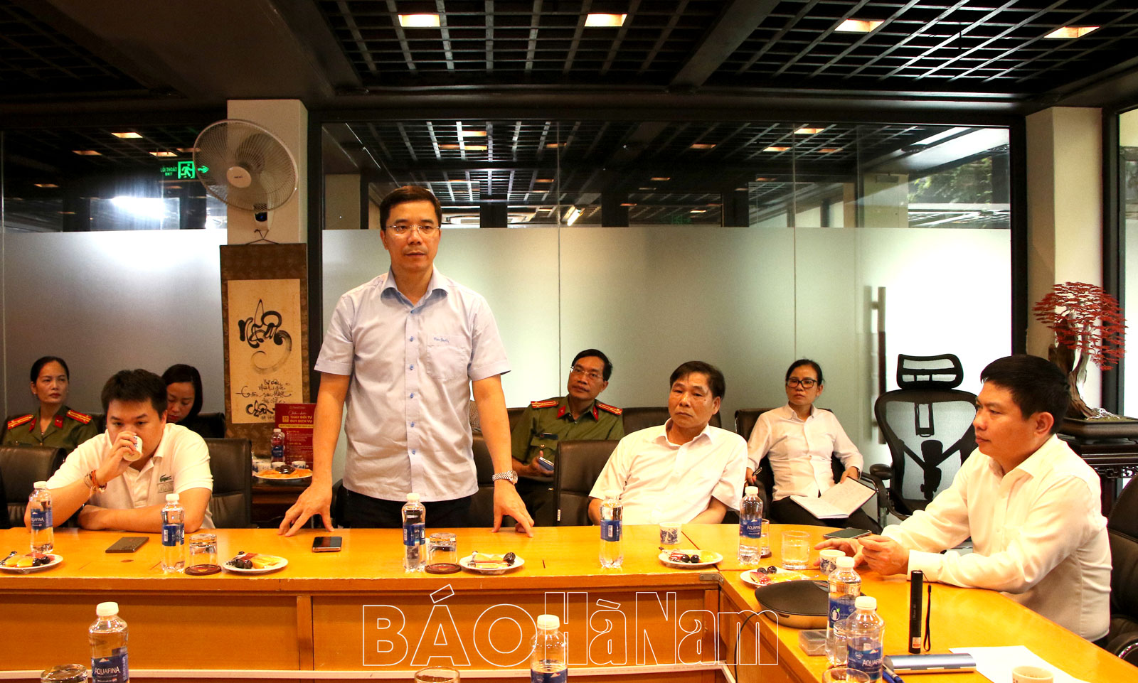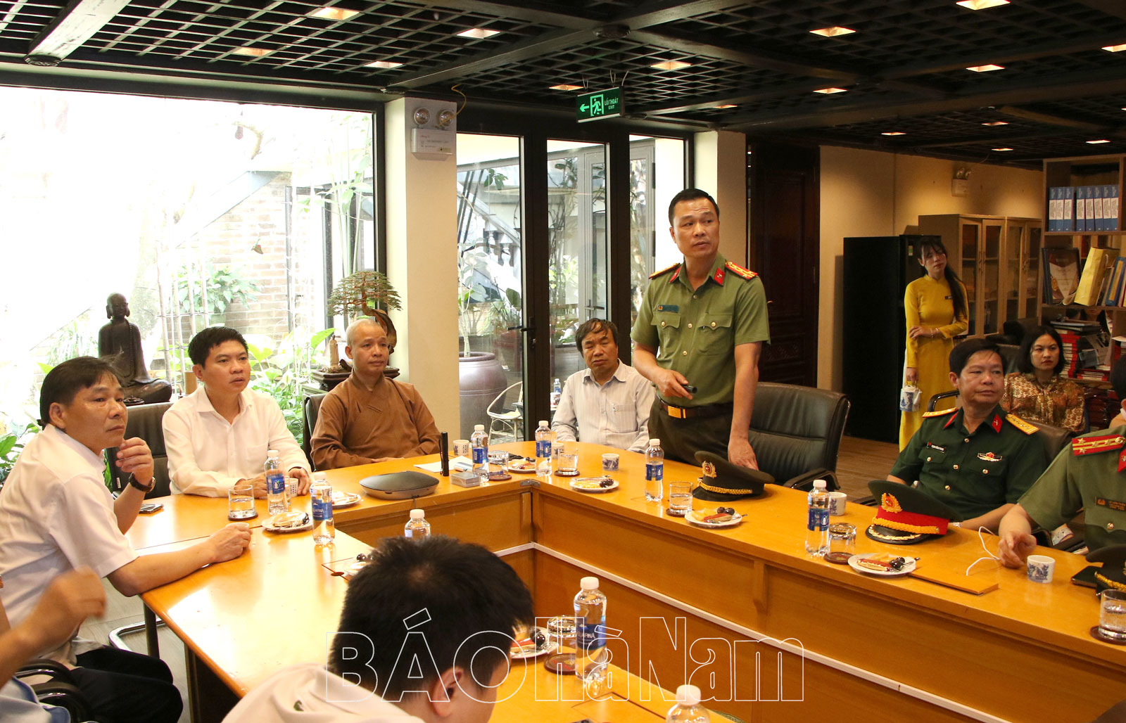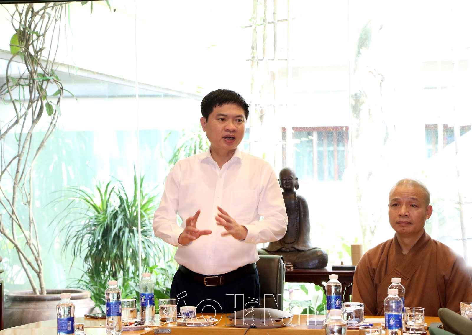 Đại diện chùa Tam Chúc báo cáo tình hình chuẩn bị Đại lễ.Đại diện lãnh đạo Cục an ninh Nội địa phát biểu tại buổi làm việc.