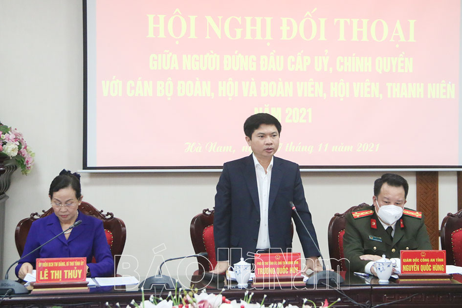 Sáng 17/11, Tỉnh ủy Hà Nam tổ chức Hội nghị đối thoại giữa người đứng đầu cấp ủy, chính quyền với cán bộ và đoàn viên, hội viên, thanh niên năm 2021 theo phương thức trực tuyến. Các đồng chí: Lê Thị Thủy, Ủy viên Trung ương Đảng, Bí thư Tỉnh ủy, Chủ tịch HĐND tỉnh; Trương Quốc Huy, Phó Bí thư Tỉnh ủy, Chủ tịch UBND tỉnh, Trưởng đoàn đại biểu Quốc hội tỉnh chủ trì hội nghị.