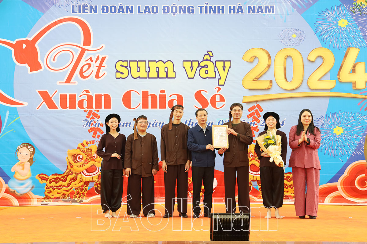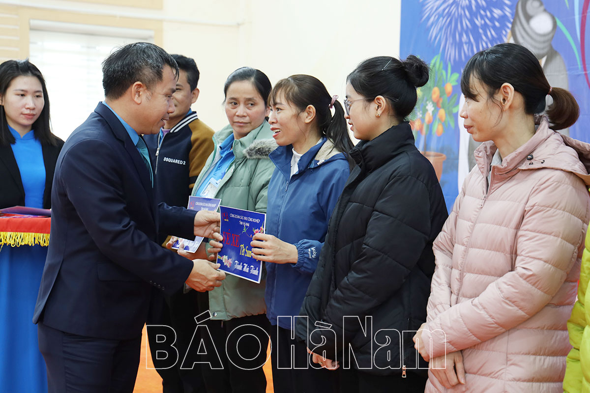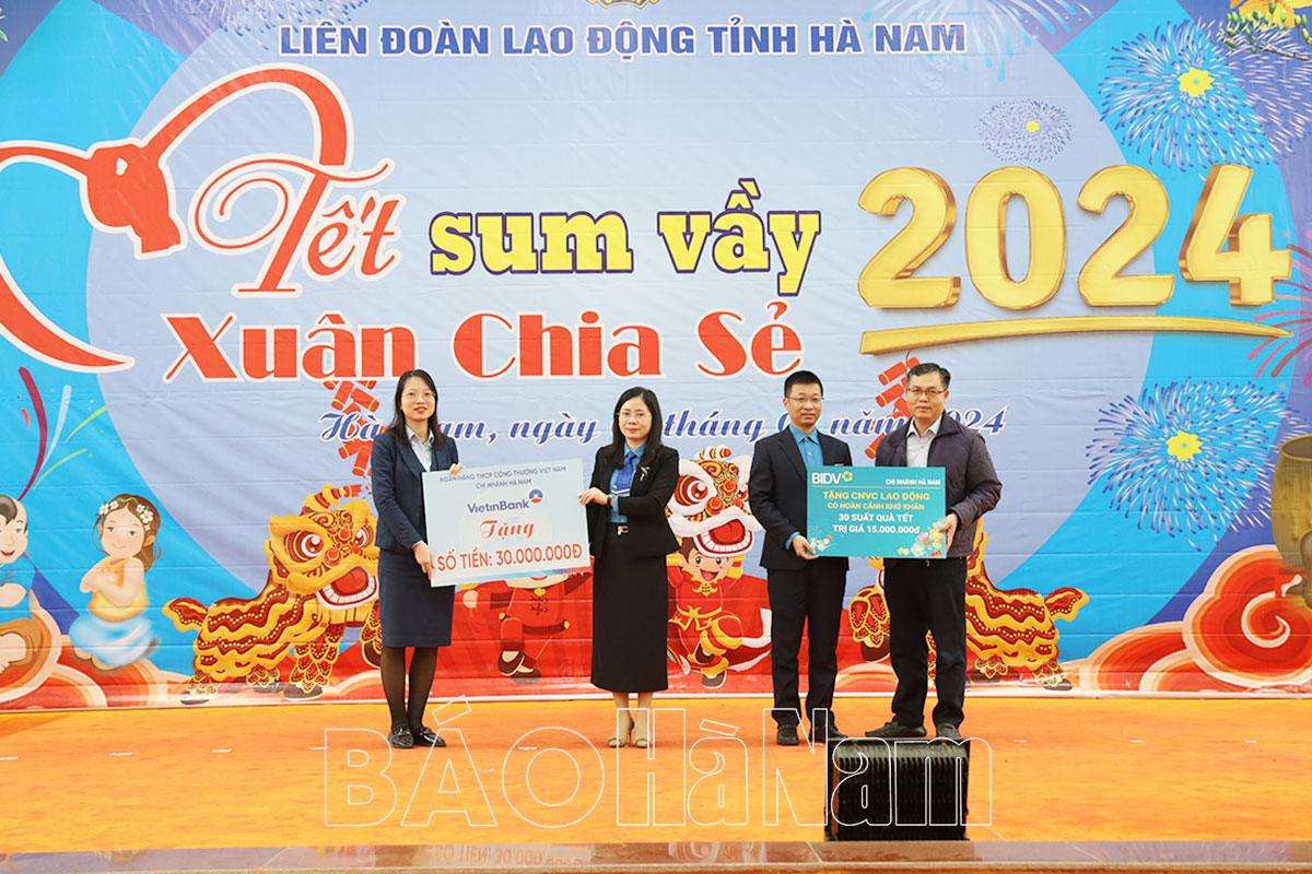 Tại chương trình, đại diện các Ngân hàng Đầu tư và Phát triển Việt Nam chi nhánh Hà Nam, Ngân hàng Thương mại cổ phần công thương Việt Nam chi nhánh Hà Nam, Ngân hàng Nông nghiệp và Phát triển nông thôn chi nhánh Hà Nam, chi nhánh Hà Nam 2 đã trao tặng biển tượng trưng kinh phí hỗ trợ chăm lo tết cho công nhân lao động trên địa bàn tỉnh Xuân Giáp Thìn 2024 với tổng số tiền 85 triệu đồng.