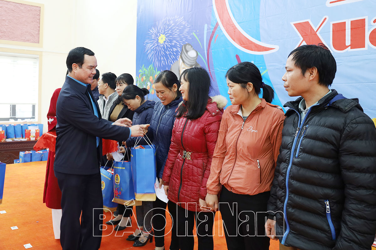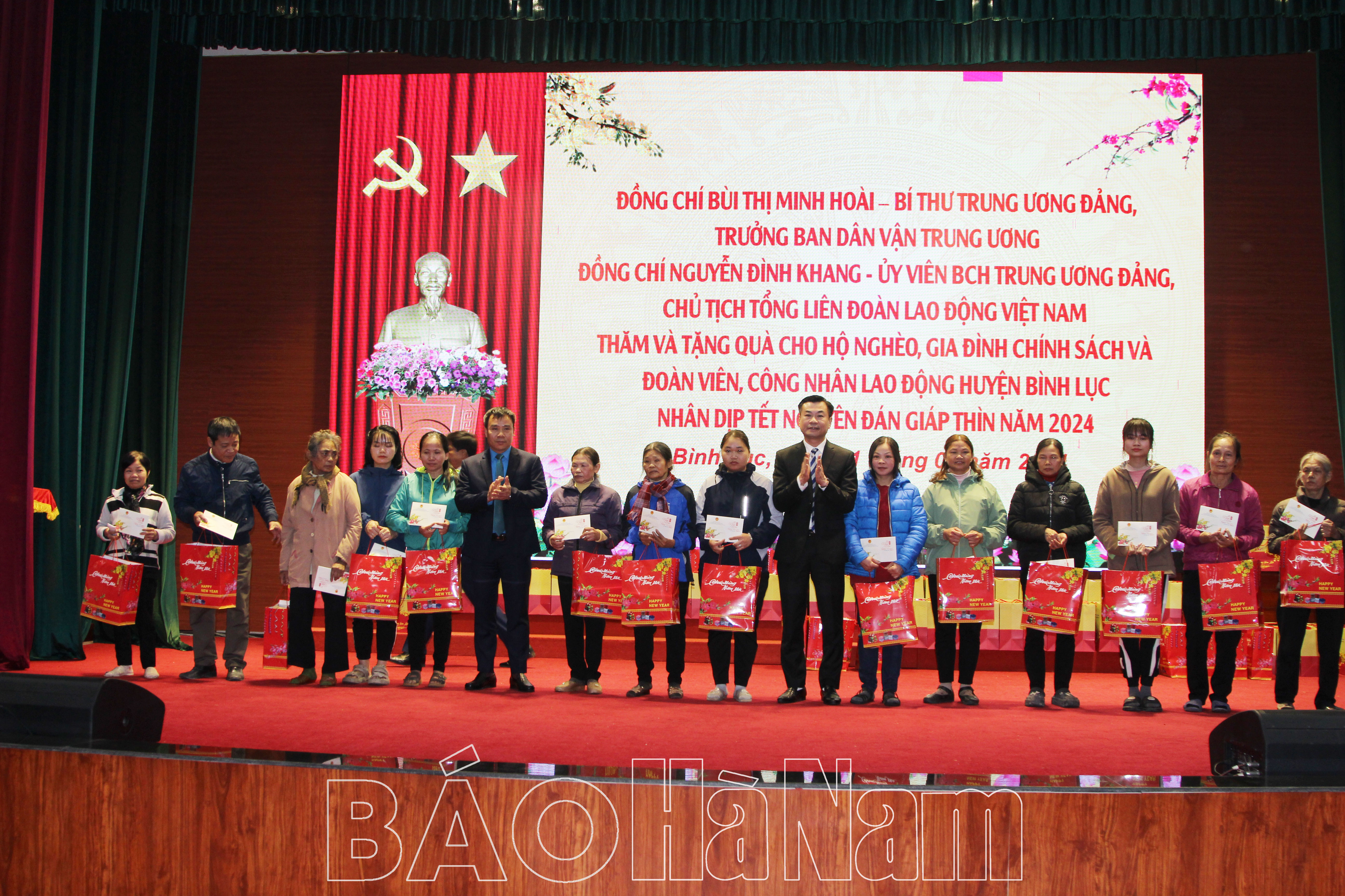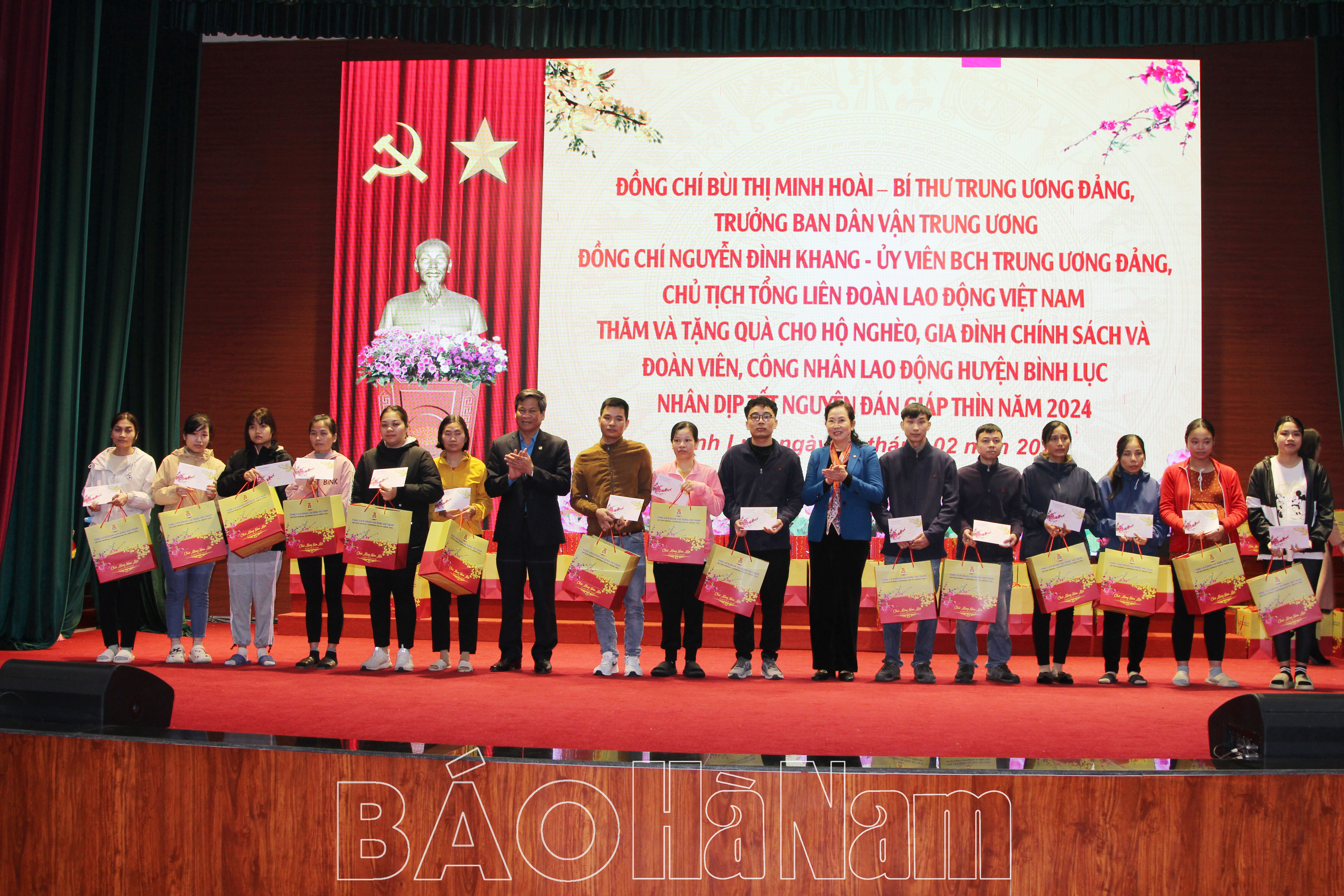 Tại buổi trao tặng quà, đại diện đoàn viên, công nhân lao động và hộ nghèo có hoàn cảnh đặc biệt khó khăn trên địa bàn Bình Lục được trao tặng 150 suất quà với tổng trị giá trên 200 triệu đồng của cá nhân đồng chí Bùi Thị Minh Hoài, Bí thư Trung ương Đảng, Trưởng Ban Dân vận Trung ương và quà của Tổng LĐLĐ Việt Nam; Bộ Lao động, Thương binh và Xã hội cùng cá nhân đồng chí Đào Ngọc Dung, Bộ trưởng Bộ Lao động, Thương binh và Xã hội gửi tặng 50 suất quà tặng hộ nghèo có hoàn cảnh đặc biệt khó khăn với trị giá trên 60 triệu đồng.
