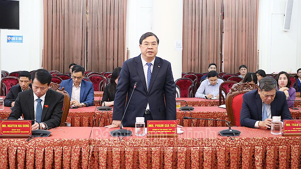 Tiếp và làm việc với Đoàn có đồng chí Phạm Gia Túc, Ủy viên BCH Trung ương Đảng, Bí thư Tỉnh ủy. Cùng tham dự buổi tiếp đón còn có các đồng chí: Trần Lê Đoài, TUV, Phó Chủ tịch UBND tỉnh; Nguyễn Hải Dũng, TUV, Phó Trưởng đoàn chuyên trách Đoàn đại biểu Quốc hội tỉnh; lãnh đạo các sở, ngành: Giáo dục và Đào tạo, Lao động - Thương binh và Xã hội, Ban Quản lý các Khu công nghiệp tỉnh, Ngân hàng Chính sách xã hội tỉnh, Văn phòng Tỉnh ủy, Văn phòng UBND tỉnh, Trường Đại học Điều dưỡng Nam Định, Trường Cao đẳng Kinh tế và Công nghệ Nam Định.