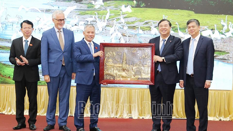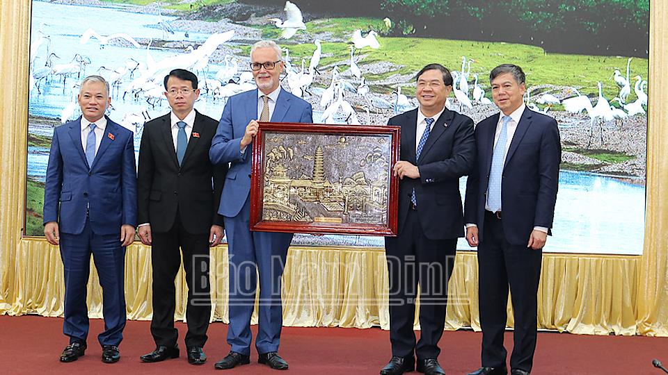 Nhân dịp này, đồng chí Bí thư Tỉnh ủy Phạm Gia Túc và các đồng chí lãnh đạo tỉnh đã tặng ngài Đại sứ Guido Hildner bức tranh Tháp Phổ Minh - biểu tượng lịch sử - văn hoá của quê hương Nam Định.