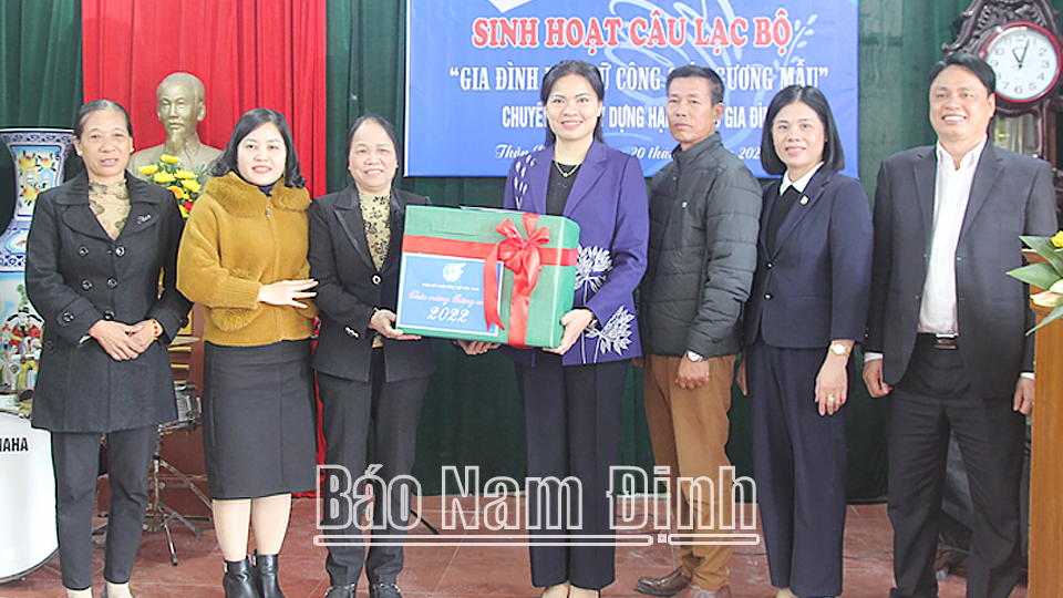 | Đồng chí Chủ tịch Hội Liên hiệp phụ nữ Việt Nam Hà Thị Nga tặng quà chúc mừng Ban chủ nhiệm câu lạc bộ “Gia đình phụ nữ người Công giáo gương mẫu” thôn Bùi Chu, xã Xuân Ngọc. |