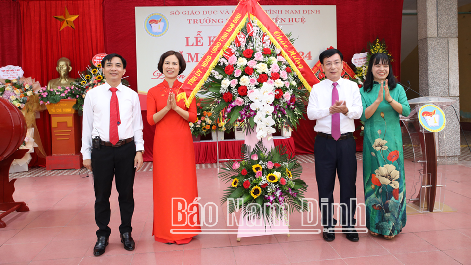 Trao tặng tập thể nhà trường lẵng hoa tươi thắm chúc mừng thầy và trò Trường THPT Nguyễn Huệ bước vào năm học mới, đồng chí Chủ tịch UBND tỉnh Phạm Đình Nghị đã phát biểu ghi nhận, biểu dương những kết quả, thành tích vượt bậc của nhà trường trong năm học vừa qua.