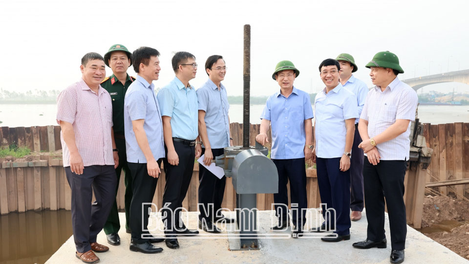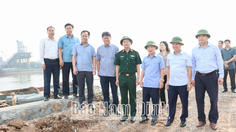 | Đồng chí Chủ tịch UBND tỉnh Phạm Đình Nghị kiểm tra đê bối, kè Yên Trị (Ý Yên) đang thi công. |