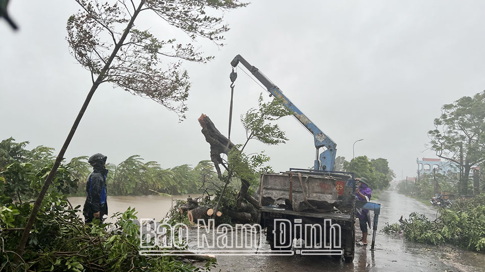 | Lực lượng chức năng xã Bình Hoà khắc phục hậu quả do bão số 3 gây ra. |