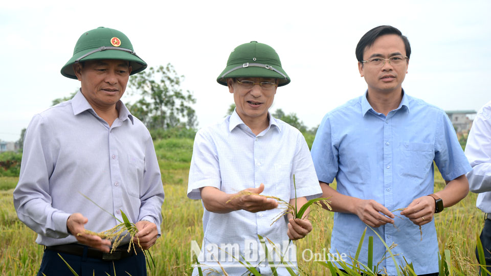 | Các đồng chí: Phạm Đình Nghị, Phó Bí thư Tỉnh ủy, Chủ tịch UBND tỉnh; Nguyễn Phùng Hoan, Ủy viên Ban TVTU, Phó Chủ tịch UBND tỉnh kiểm tra kết quả sản xuất vụ mùa tại xã Mỹ Thịnh (Mỹ Lộc). |