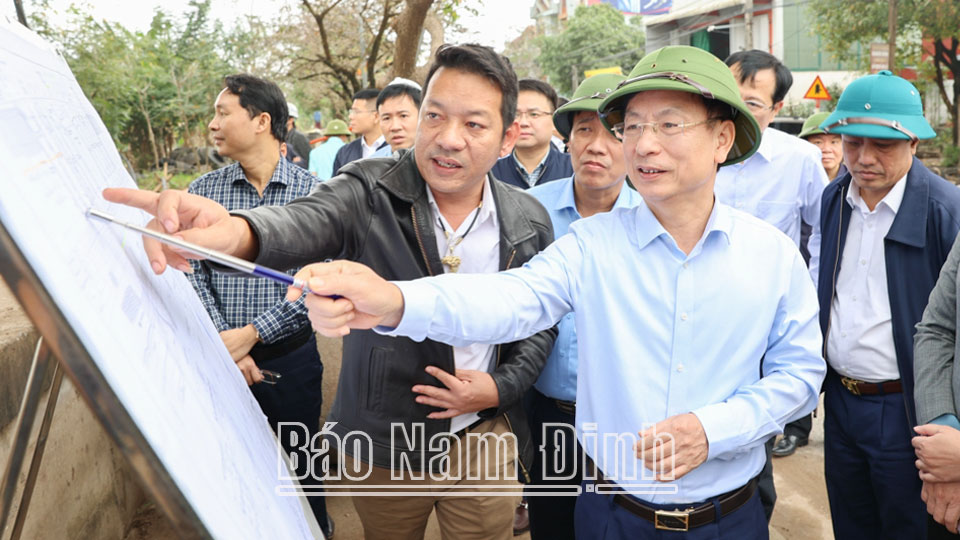 | Đồng chí Chủ tịch UBND tỉnh Phạm Đình Nghị kiểm tra tiến độ triển khai thực hiện dự án Xây dựng tuyến đường bộ mới Nam Định - Lạc Quần - Đường bộ ven biển đoạn qua huyện Trực Ninh. |