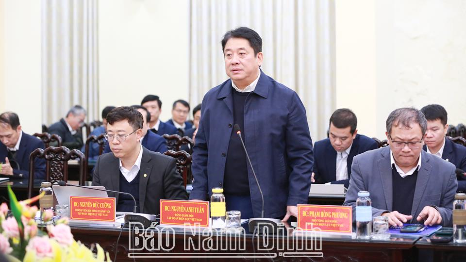 Phát biểu tại buổi làm việc, đồng chí Chủ tịch UBND tỉnh Phạm Đình Nghị nhấn mạnh: Hai năm trở lại đây, tỉnh chuyển mình phát triển nhanh; cùng với lộ trình bứt tốc trong thu hút đầu tư, nhất là các dự án công nghệ cao theo Quy hoạch tỉnh đã được phê duyệt cho thấy nhu cầu sử dụng điện của tỉnh trong thời gian tới tăng nhanh và tăng cao. Tỉnh đề nghị EVN, Tổng Công ty truyền tải điện quốc gia, Tổng Công ty Điện lực miền Bắc tăng cường phối hợp với tỉnh rà soát, thống nhất nhu cầu sử dụng điện sát thực tế; tập trung nguồn lực để xây dựng các công trình điện theo các quy hoạch đã được phê duyệt; bảo đảm hiệu quả cao nhất trong nhiệm vụ cấp điện cho phát triển kinh tế - xã hội cũng như đời sống sinh hoạt của nhân dân trên địa bàn tỉnh. Trước mắt, cần đặc biệt quan tâm đến các dự án Xây dựng mới đường dây và TBA 110kV Khu công nghiệp Mỹ Thuận; xây dựng mới đường dây và TBA 110kV Yên Thành; bổ sung danh mục dự án trạm 220kV Giao Thủy (2x250 MVA) theo quy hoạch để đảm bảo nguồn cấp cho khu vực các huyện Xuân Trường, Giao Thủy… do đây là các khu vực trọng điểm trong thu hút đầu tư phát triển sản xuất công nghiệp của tỉnh trong giai đoạn hiện nay.