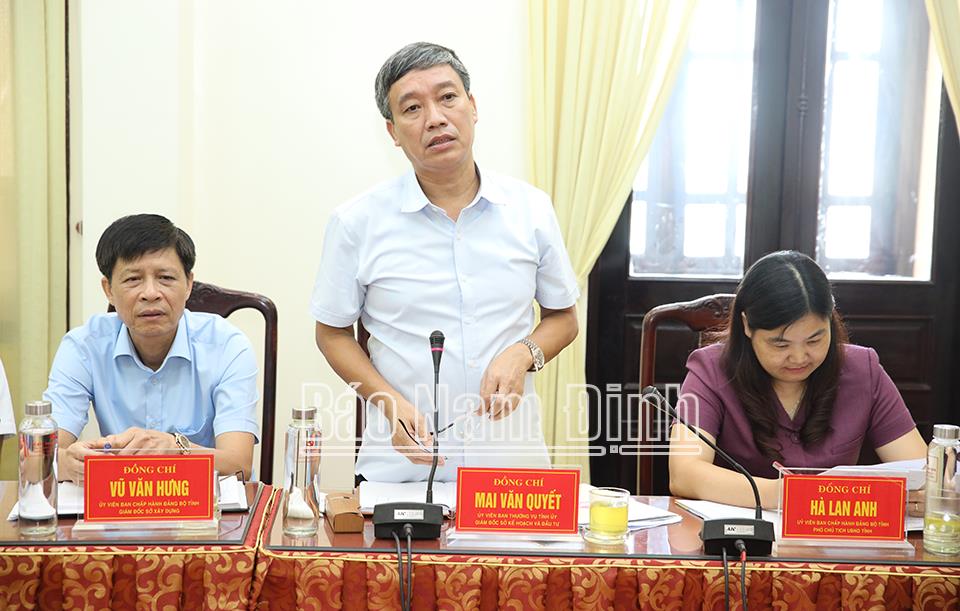 | Đồng chí Mai Văn Quyết, Ủy viên Ban TVTU, Giám đốc Sở KH và ĐT phát biểu tại buổi làm việc. |