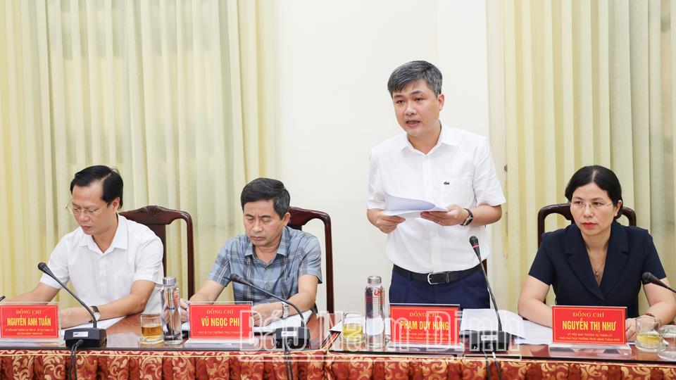 | Đồng chí Phạm Duy Hưng, TUV, Chủ tịch UBND thành phố Nam Định báo cáo tại buổi làm việc. |