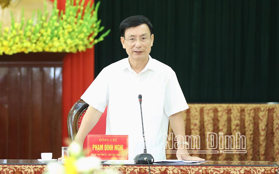 Ngày 22-8, đồng chí Phạm Đình Nghị, Phó Bí thư Tỉnh ủy, Chủ tịch UBND tỉnh, Phó Trưởng Ban Thường trực Ban Chỉ đạo giải phóng mặt bằng (GPMB) phục vụ phát triển kinh tế - xã hội tỉnh giai đoạn 2022-2025 chủ trì buổi làm việc với Ban Chỉ đạo GPMB thành phố Nam Định về công tác lãnh đạo, chỉ đạo thực hiện nhiệm vụ GPMB trên địa bàn. Dự buổi làm việc có đồng chí Hà Lan Anh, TUV, Phó Chủ tịch UBND tỉnh; lãnh đạo các sở, ngành liên quan và lãnh đạo Văn phòng UBND tỉnh.