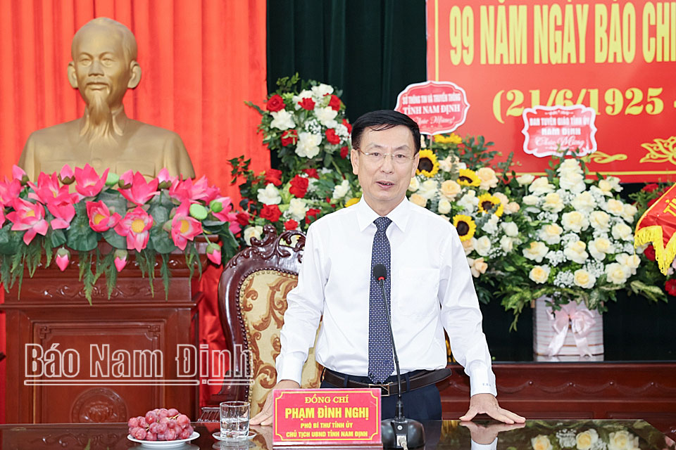 Nhân dịp kỷ niệm 99 năm Ngày Báo chí cách mạng Việt Nam, sáng 20/6, thay mặt Tỉnh ủy, HĐND, UBND tỉnh, đồng chí Phạm Đình Nghị, Phó Bí thư Tỉnh ủy, Chủ tịch UBND tỉnh đến thăm, chúc mừng tập thể cán bộ, phóng viên, nhân viên Báo Nam Định.