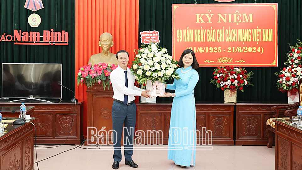 | Đồng chí Phạm Thị Thu Hằng, Ủy viên Ban TVTU, Trưởng Ban Tuyên giáo Tỉnh ủy tặng hoa chúc mừng cán bộ, phóng viên, biên tập viên, người lao động Báo Nam Định. |