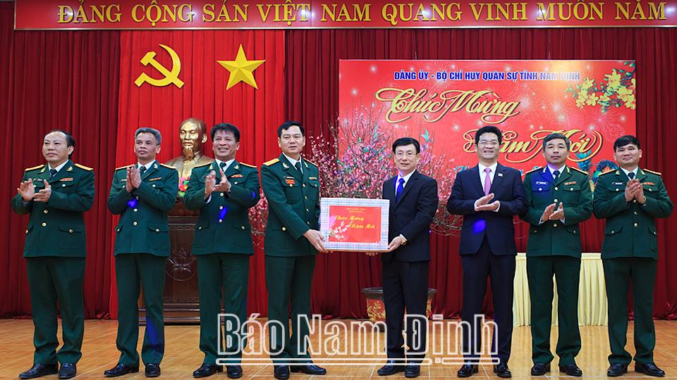 | Đồng chí Chủ tịch UBND tỉnh Phạm Đình Nghị tặng quà chúc Tết cán bộ, chiến sĩ Bộ CHQS tỉnh. |